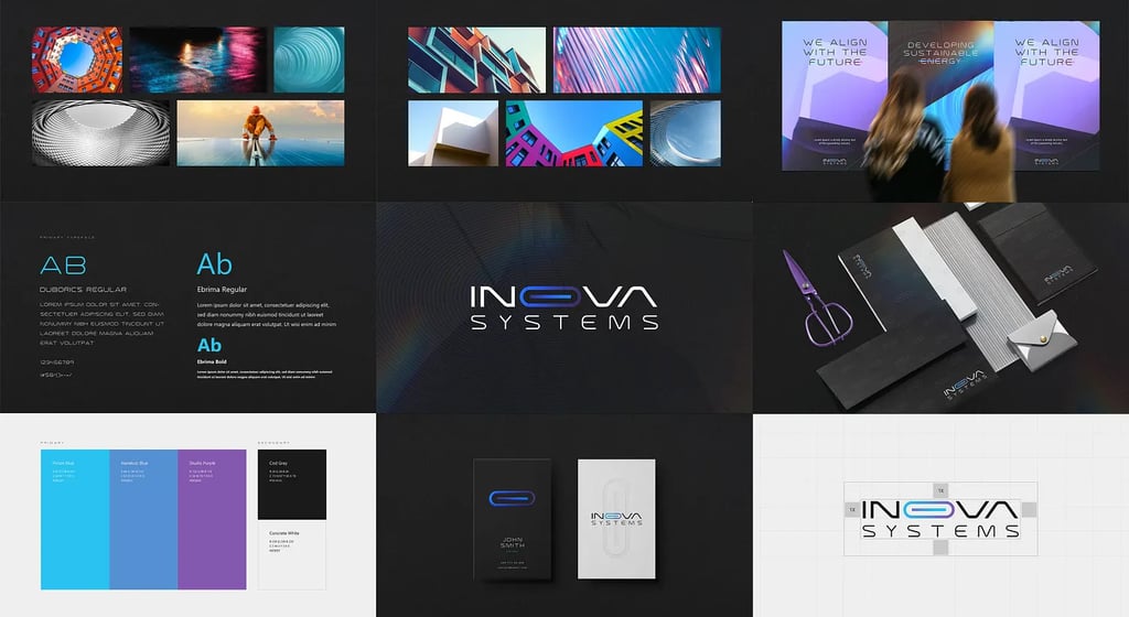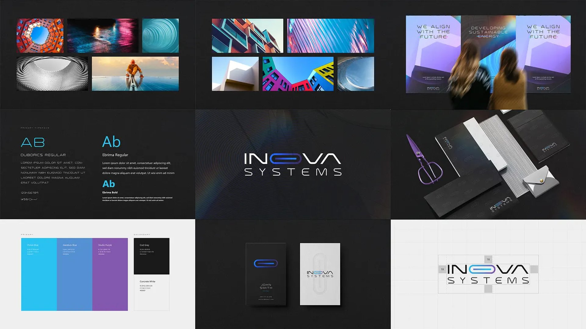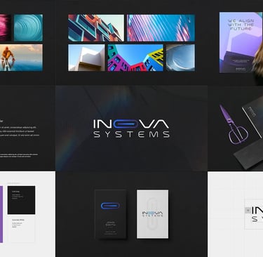 A bold and modern brand identity system created for INOVA Systems, featuring a futuristic logo, clean typography, sharp visuals, and a vibrant, innovative color palette.